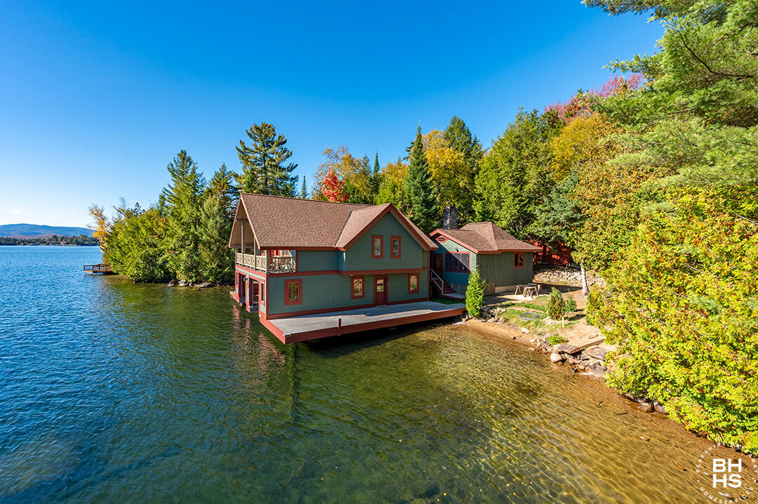Buck Bay South is a boathouse constructed in the early 2000s with a connected 1930s cabin, set on Buck Island. This distinctive waterfront property blends modern comfort with classic Adirondack charm, highlighted by a spacious porch with sweeping views of Pulpit Rock. The property offers three bedrooms and two full bathrooms across its thoughtfully designed living spaces.