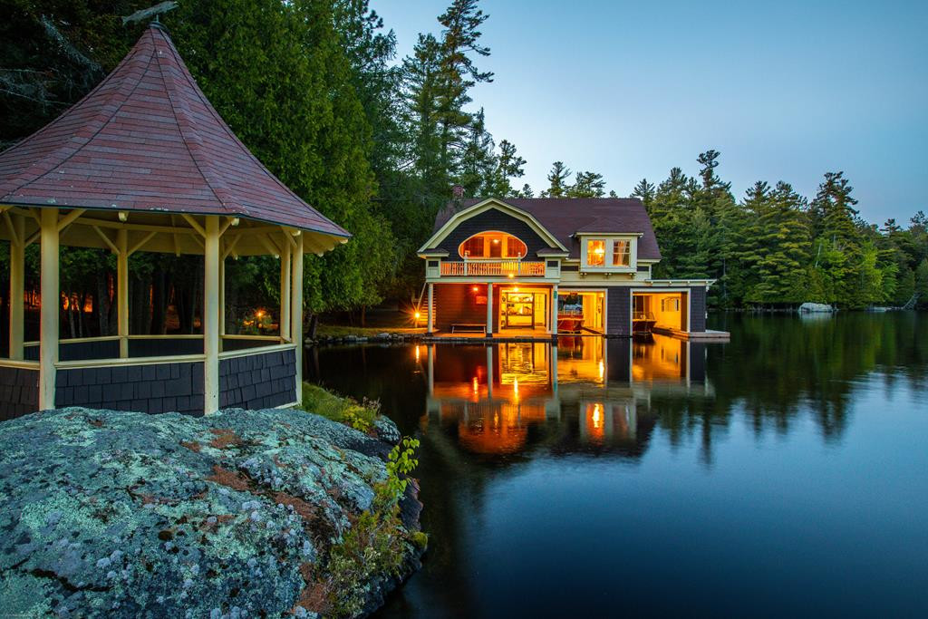 A gracious treasure on the shore of Upper Saranac Lake. Originally built in 1898 by Robert Dun Douglass and later purchased by Alix Stanley of “Stanley Tools,” Camp Dancing Waters has been preserved in impeccable condition for over 115 years. Its signature boathouse has 2 unprecedented drive-through slips together with a distinguishing eyebrow roof dormer. The property is comprised of 24.5 acres of land and 1,200 FT of shoreline on Douglass Point with level access to the water and exceptional lake and mountain views. The main camp offers roughly 6,000 SF of living space including 7 bedrooms, 4 fireplaces, wrap-around porches, glass bowed sunroom, formal dining room an attached 2 car garage